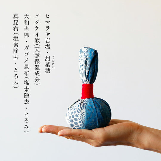 入浴剤が封じられている布素材は和のエッセンスである浴衣の素材を使用していますので肌触りも確かめてみてください。布越しの香りを楽しんだのち、浴槽にそのまま沈めます。