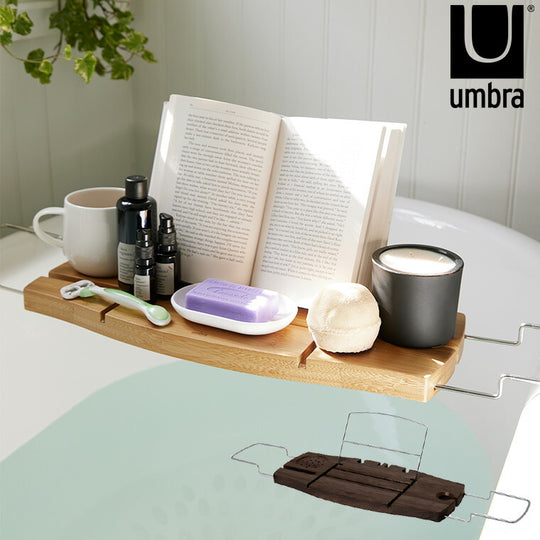 カナダ生まれのデザインブランドUmbraのおしゃれなバスタブキャディ。サイドにある溝にはスマホが縦にも横にも置けるようになっているので動画や映画を観たり、音楽を聴きながらゆっくりお風呂に浸かることができます。背面にある溝にはカミソリやボディスポンジがひっかけられるようになっていてとても便利!ブックスタンドには本や雑誌、タブレットを置いてバスタイムを最高の癒し時間に♪