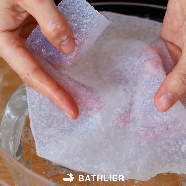 こんにゃくスポンジは、こんにゃく繊維が水をよく含むので「水の膜」で洗うことができます。