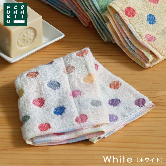 タオルの域を超えた包まれたくなるやさしい風合いにポップなドット柄のタオルは、やさしさいっぱい、元気100倍、そんなタオルシリーズ。